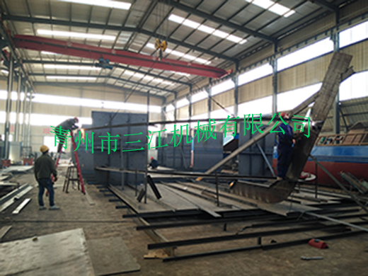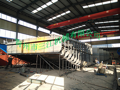 本設備為分體式鋼質(zhì)皮帶自卸運沙船,額定運載能力為500噸,滿(mǎn)載排水量為906噸。滿(mǎn)載行駛速度為每小時(shí)20公里,
