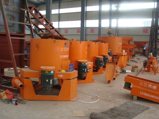 本設備是代替汞板的沙金富集設備,處理量為10-12T/h,配用動(dòng)力7.5kw6極電動(dòng)機一臺,外筒直徑1.1米,設備總高1.58米,給礦粒度0.4-0.6mm,給礦濃度為30%,凈選率在90%以上,設備總重約1000kg.