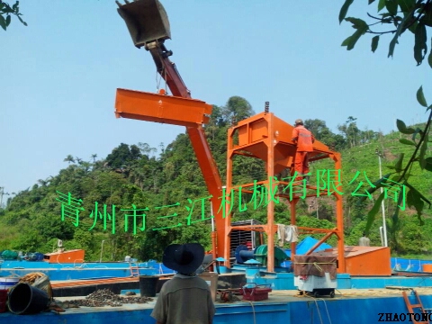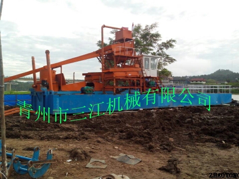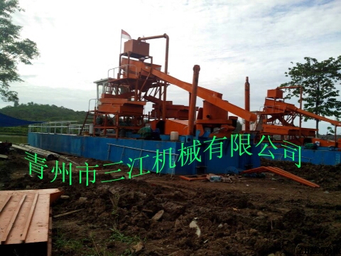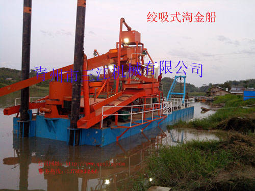 本設備的上料系統為6英寸抽沙泵,抽沙形式為絞刀頭和泵組成的絞吸式抽沙系統,篩分系統為多層振動(dòng)篩。淘金系統為兩套鼓動(dòng)式淘金溜槽和固定式淘金氈溜槽組成的組合淘金槽。另外還配有一套60型淘金離心機。本設備挖掘深度為16米,由于是由絞刀頭組成的絞吸式抽沙方式,所以可以適應復雜的工況條件,比如含有硬泥層的地形。