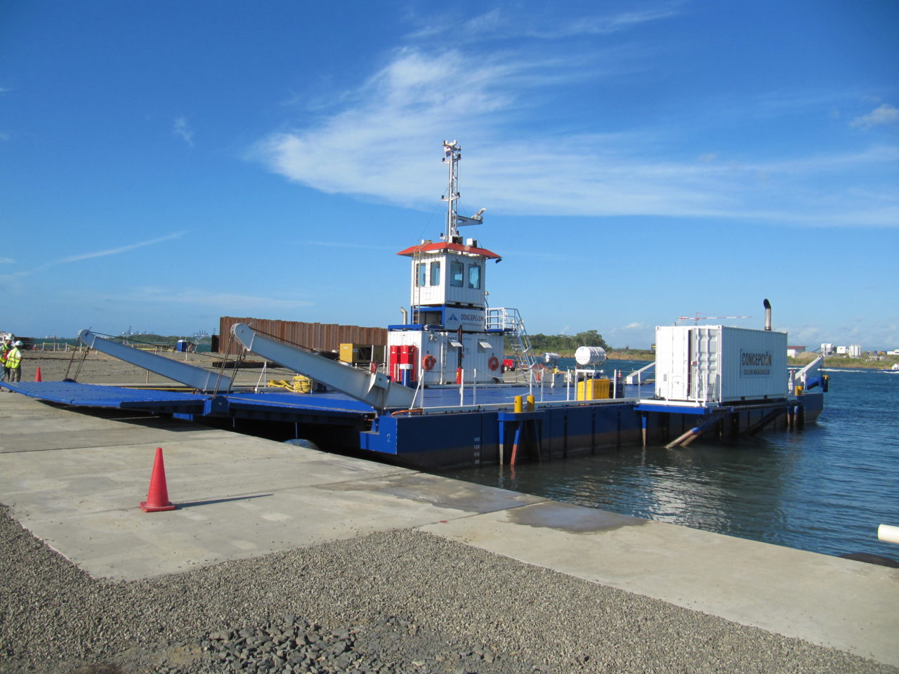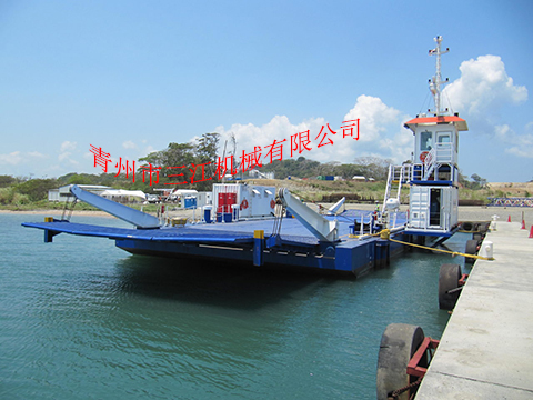 分體拼接組裝式通行駁船:本設備為鋼質(zhì)分體拼接式駁船,可運輸車(chē)輛、人員、散雜貨、噸袋、集裝箱。整套設備可方便的進(jìn)行拆卸后卡車(chē)運輸,每件的重量不超過(guò)28噸,長(cháng)度和寬度都適合公路運輸的要求??ㄜ?chē)運輸至工作地后,卸車(chē)的同時(shí)在水中快速組裝。